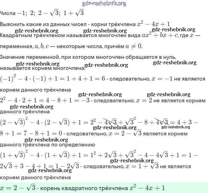 gdz-reshebnik.org - сайт готовых домашних заданий и решебников для школьников по Алгебре для девятого класса. Предоставляем готовые ответы на задания, авторские материалы к Рабочей тетради Миндюк, Шлыкова Часть 1, 2 - §3. Квадратный трёхчлен и его корни 2 . Основная часть контента представлена в бесплатном онлайн-формате с удобным и простым интерфейсом.