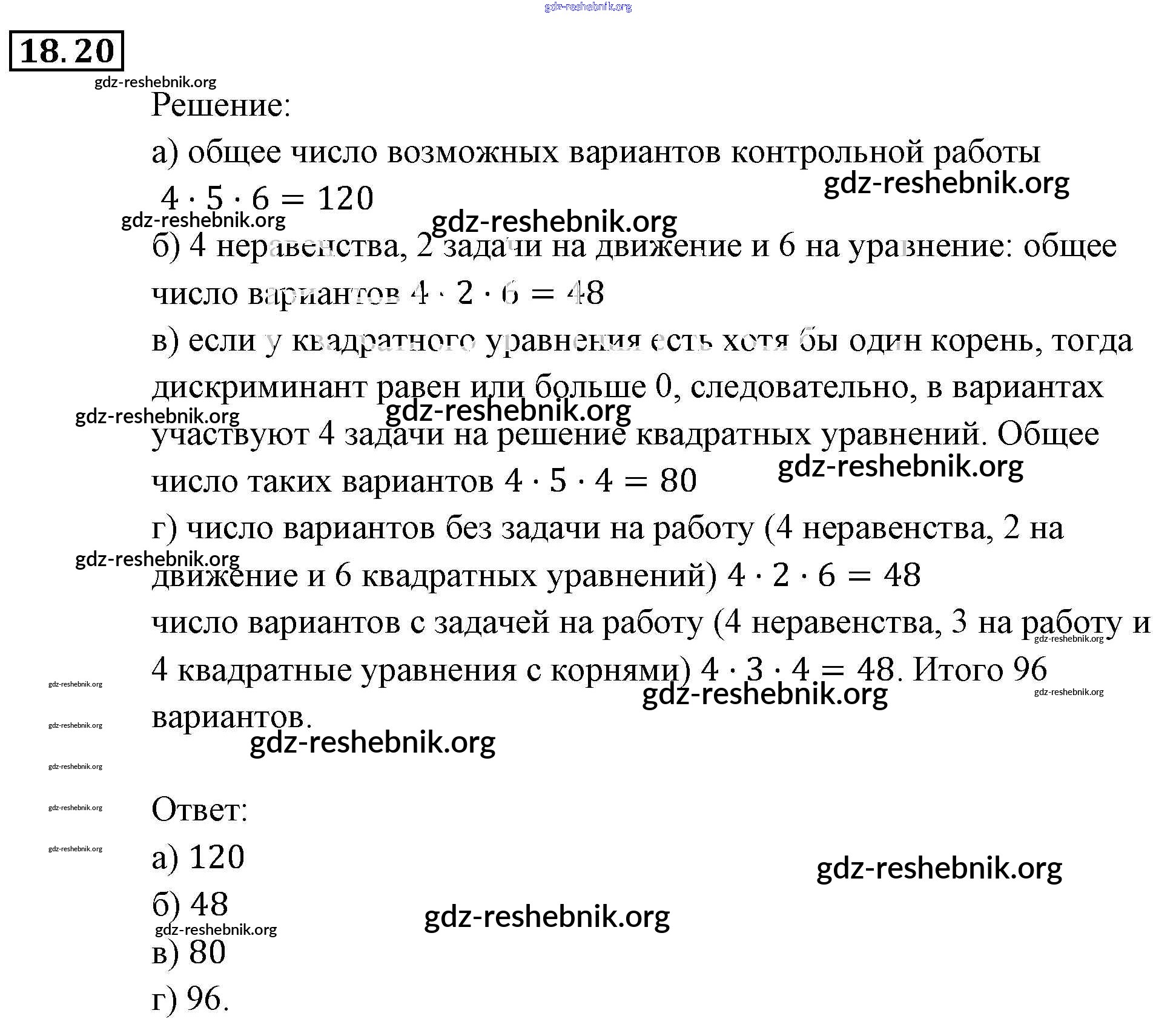 gdz-reshebnik.org - сайт готовых домашних заданий и решебников для школьников по Алгебре для девятого класса. Предоставляем готовые ответы на задания, авторские материалы к Задачнику Мордкович, Александрова Часть 2 - § 18. Комбинаторные задачи 20 . Основная часть контента представлена в бесплатном онлайн-формате с удобным и простым интерфейсом.