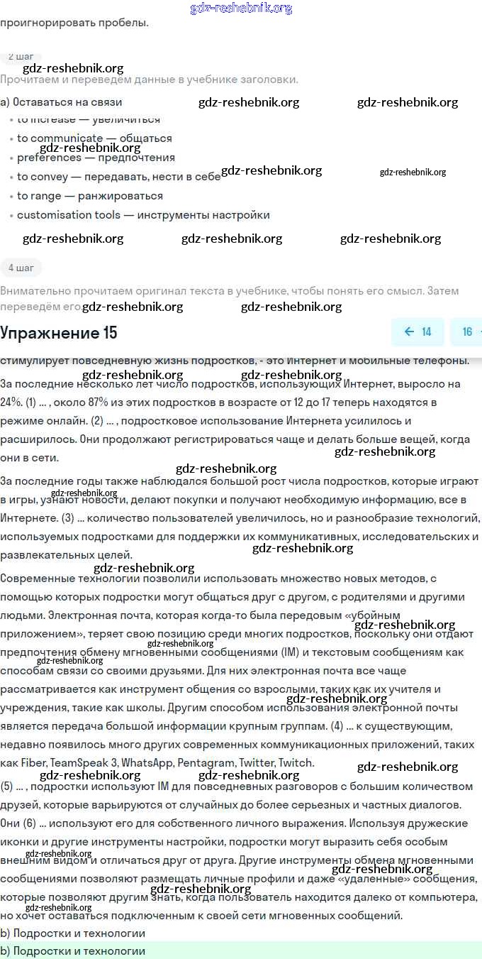 gdz-reshebnik.org - сайт готовых домашних заданий и решебников для школьников по Английскому языку для одиннадцатого класса. Предоставляем готовые ответы на задания, авторские материалы к Учебнику Биболетова, Бабушис Enjoy English - Unit 3. New Technological World 15 . Основная часть контента представлена в бесплатном онлайн-формате с удобным и простым интерфейсом.