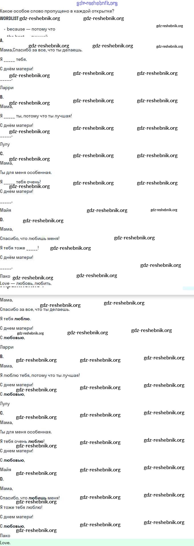 gdz-reshebnik.org - сайт готовых домашних заданий и решебников для школьников по Английскому языку для третьего класса. Предоставляем готовые ответы на задания, авторские материалы к Учебнику Быкова, Эванс Spotlight - Mother`s Day 1 . Основная часть контента представлена в бесплатном онлайн-формате с удобным и простым интерфейсом.