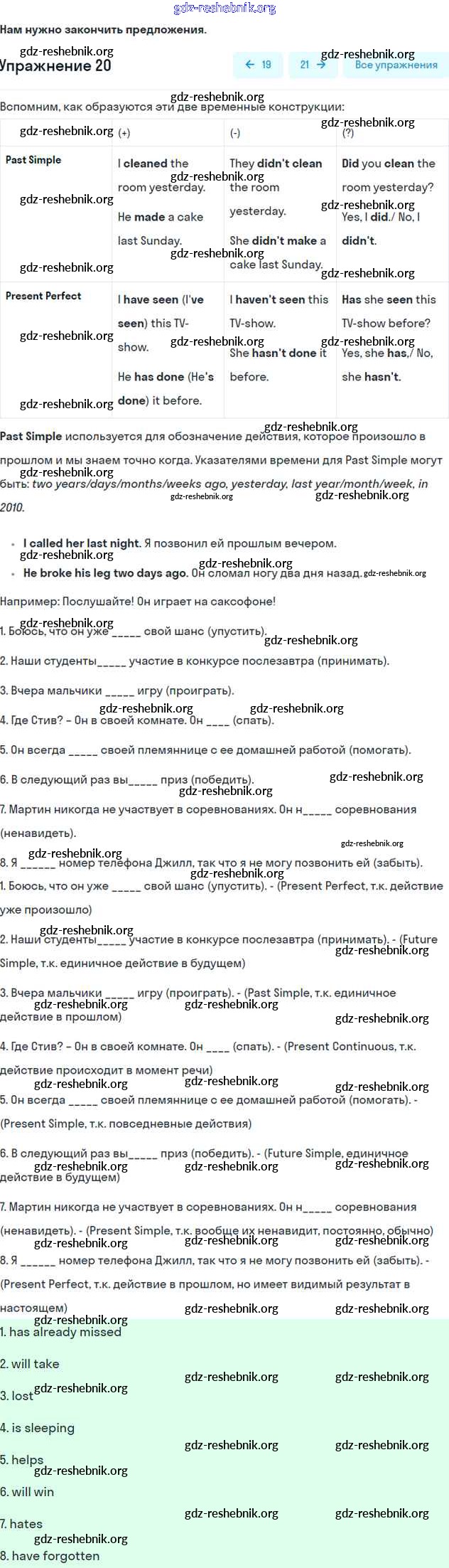 gdz-reshebnik.org - сайт готовых домашних заданий и решебников для школьников по Английскому языку для седьмого класса. Предоставляем готовые ответы на задания, авторские материалы к Учебнику Биболетова, Трубанева УМК - Exercises 20 . Основная часть контента представлена в бесплатном онлайн-формате с удобным и простым интерфейсом.