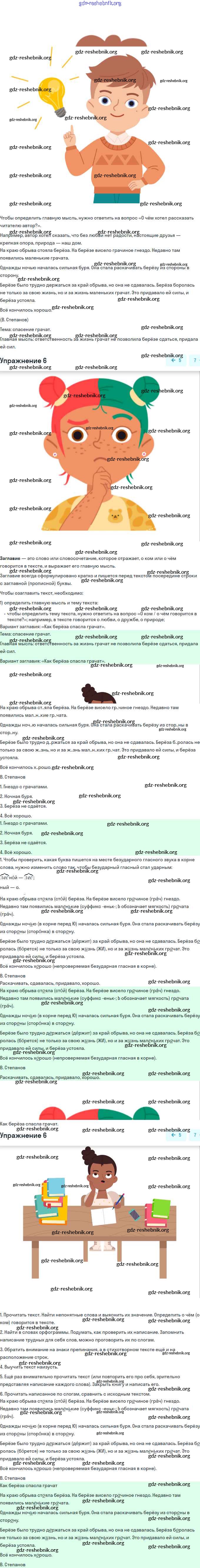 gdz-reshebnik.org - сайт готовых домашних заданий и решебников для школьников по Русскому языку для третьего класса. Предоставляем готовые ответы на задания, авторские материалы к Учебнику Канакина, Горецкий Школа России Часть 1, 2 - Упражнения 6 . Основная часть контента представлена в бесплатном онлайн-формате с удобным и простым интерфейсом.