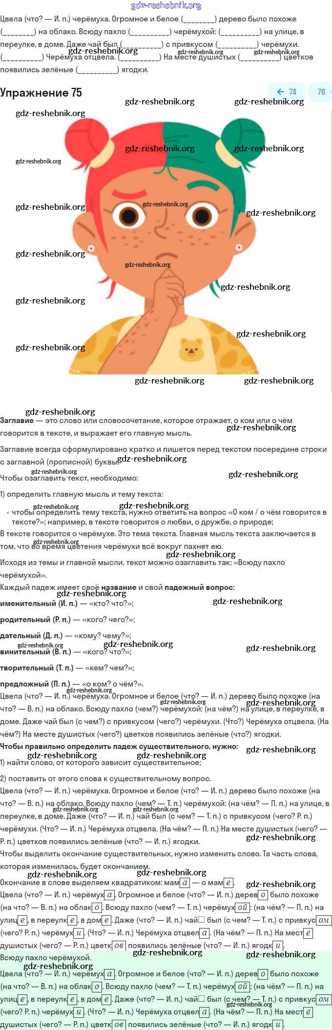 gdz-reshebnik.org - сайт готовых домашних заданий и решебников для школьников по Русскому языку для третьего класса. Предоставляем готовые ответы на задания, авторские материалы к Рабочей тетради Климанова, Бабушкина Перспектива Часть 1, 2 - Часть 2. Упражнения 75 . Основная часть контента представлена в бесплатном онлайн-формате с удобным и простым интерфейсом.