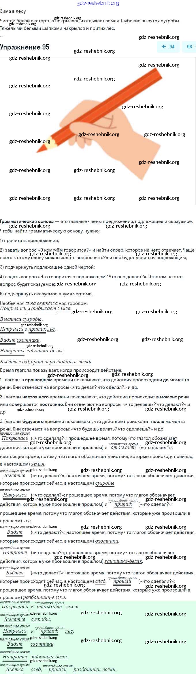 gdz-reshebnik.org - сайт готовых домашних заданий и решебников для школьников по Русскому языку для третьего класса. Предоставляем готовые ответы на задания, авторские материалы к Рабочей тетради Климанова, Бабушкина Перспектива Часть 1, 2 - Часть 2. Упражнения 95 . Основная часть контента представлена в бесплатном онлайн-формате с удобным и простым интерфейсом.